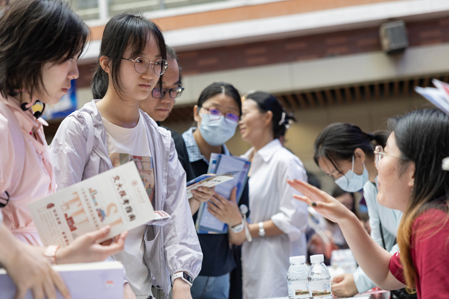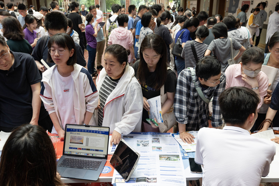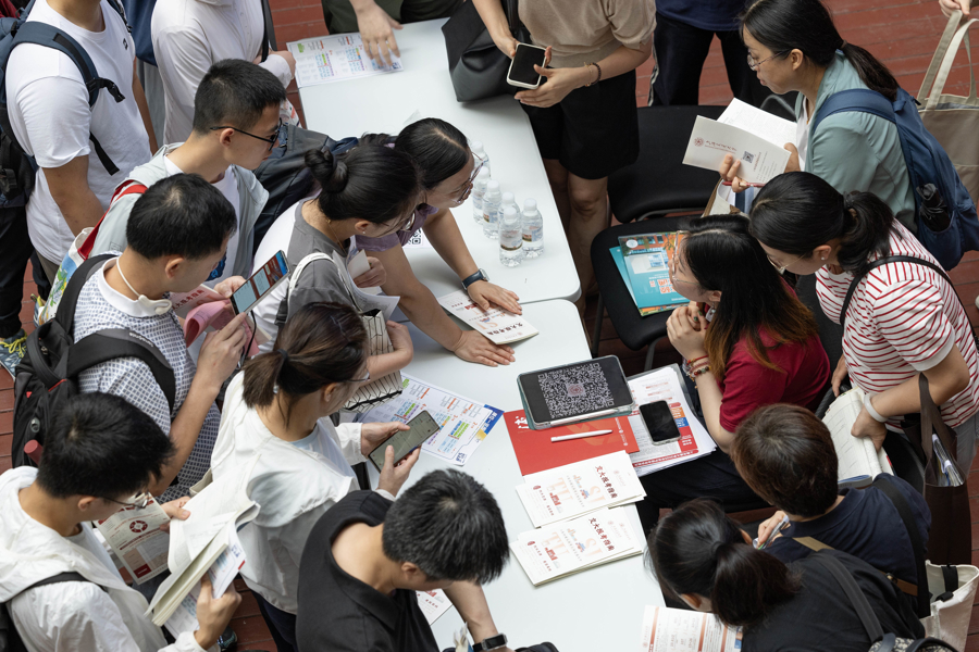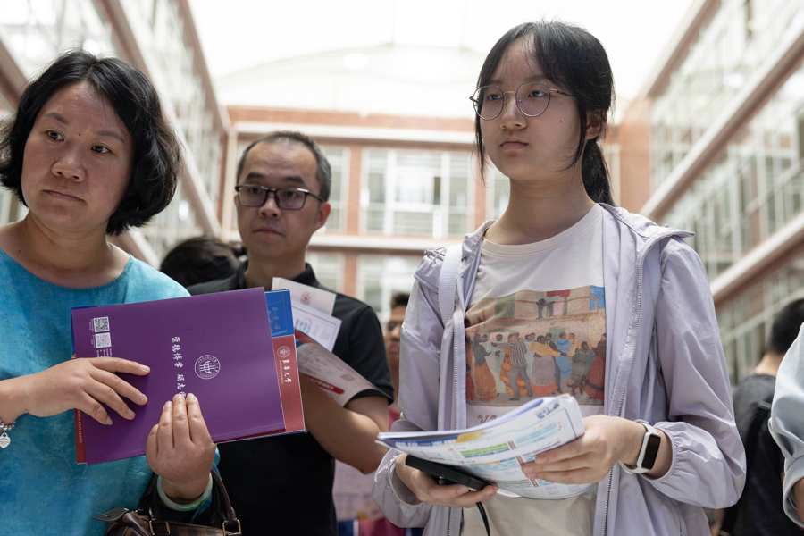 6月24日,2025年“知分知位·百校集聚 我们一起填志愿”上海市普通高校志愿填报咨询会在上海杉达学院举行。曹杨二中考生张悦手握610分的高考分数,辗转于复旦和交大的摊位前。