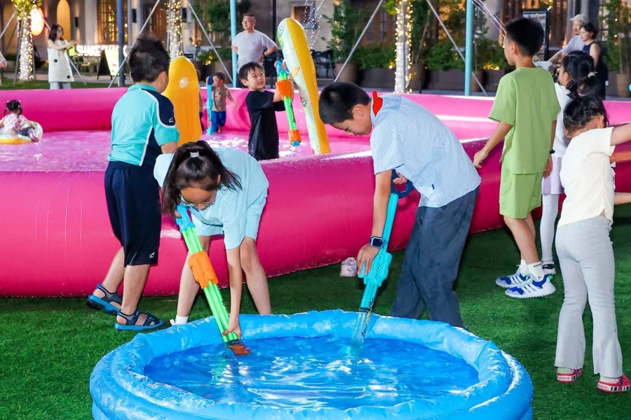 百年钟楼前,婆娑椰林、碧海金沙映入眼帘,户外草坪设有沙滩休憩区、棕榈树打卡点、海浪声光装置、巨型水池等元素,移步易景,让人足不出沪即可享受城市微度假体验。庆典期间,将引入夏日主题互动,包括水枪泡泡大战、联合上海随舞团体X-party打造泳池派对、推出限定海岛风露天影院等。