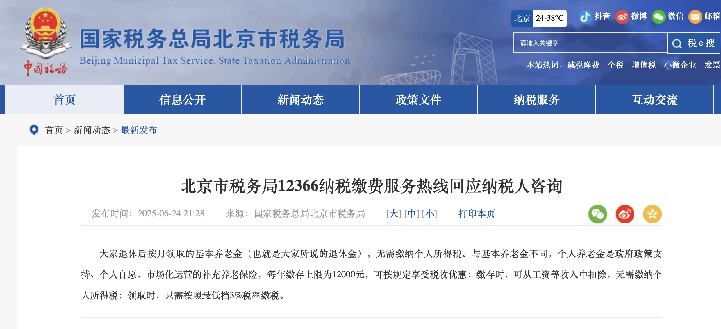 人民财讯6月24日消息,北京市税务局12366纳税缴费服务热线回应纳税人咨询称,大家退休后按月领取的基本养老金(也就是大家所说的退休金),无需缴纳个人所得税。与基本养老金不同,个人养老金是政府政策支持、个人自愿、市场化运营的补充养老保险,每年缴存上限为12000元,可按规定享受税收优惠:缴存时,可从工资等收入中扣除,无需缴纳个人所得税;领取时,只需按照最低档3%税率缴税。