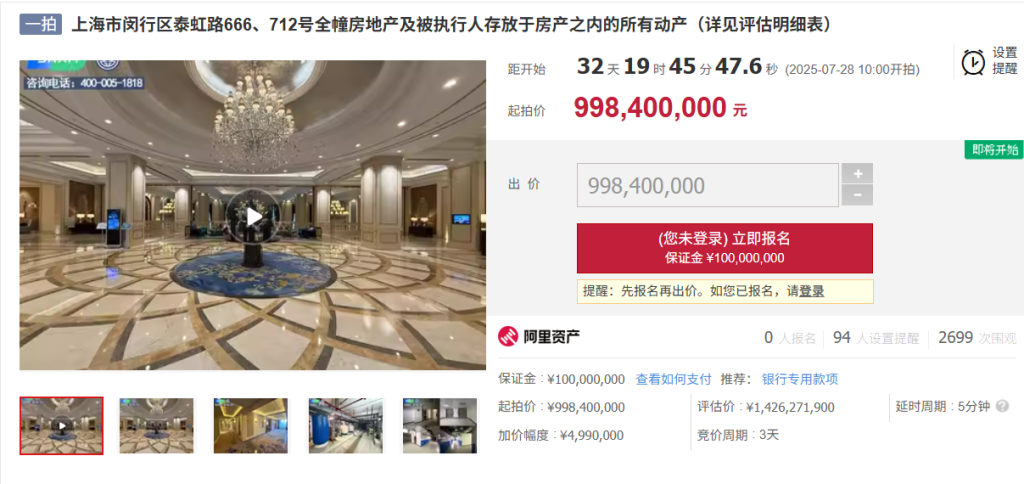 6月25日,根据阿里资产网披露的信息显示,上海新华联索菲特大酒店将于7月28日10时至31日10时在淘宝网公开司法拍卖,起拍价9.98亿元,评估价约14.26亿元,折算下来正好7折起拍。