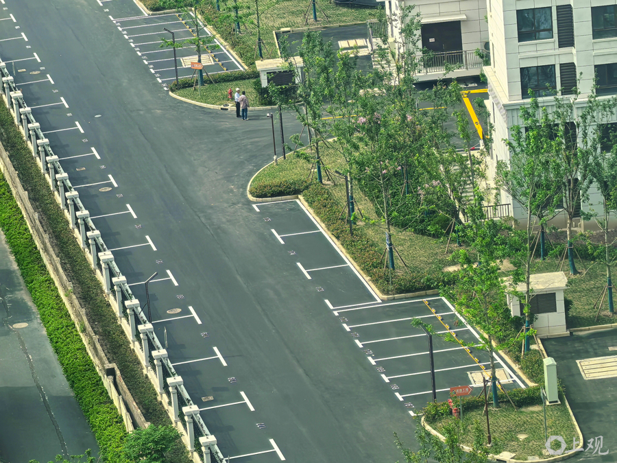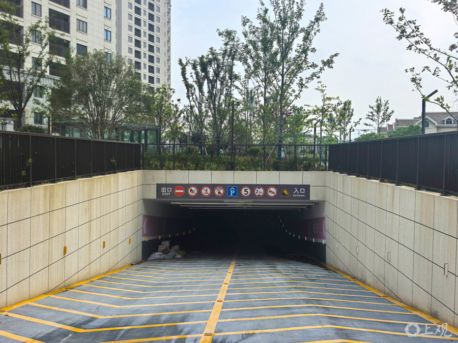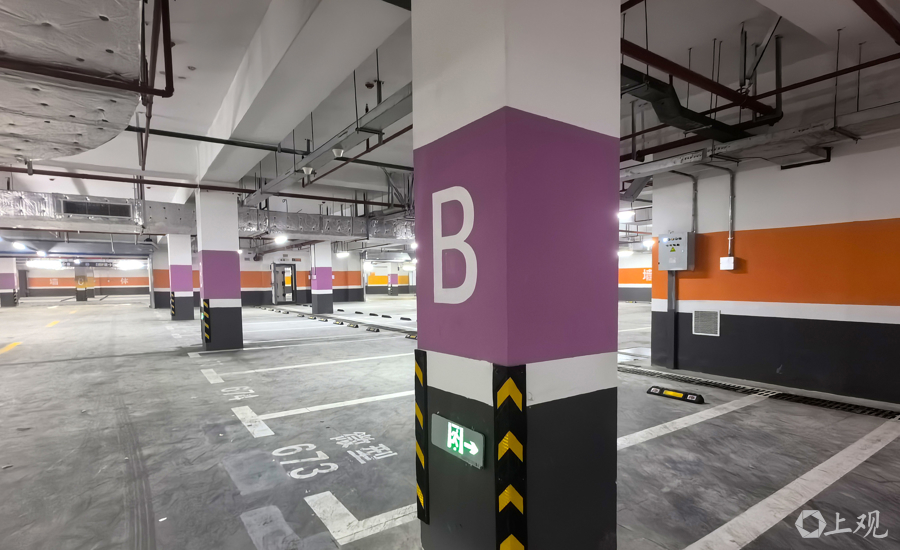 小区地上配备有200余个车位,涂装已全部完成,墙面用醒目颜色进行分区,指示牌清晰明了。