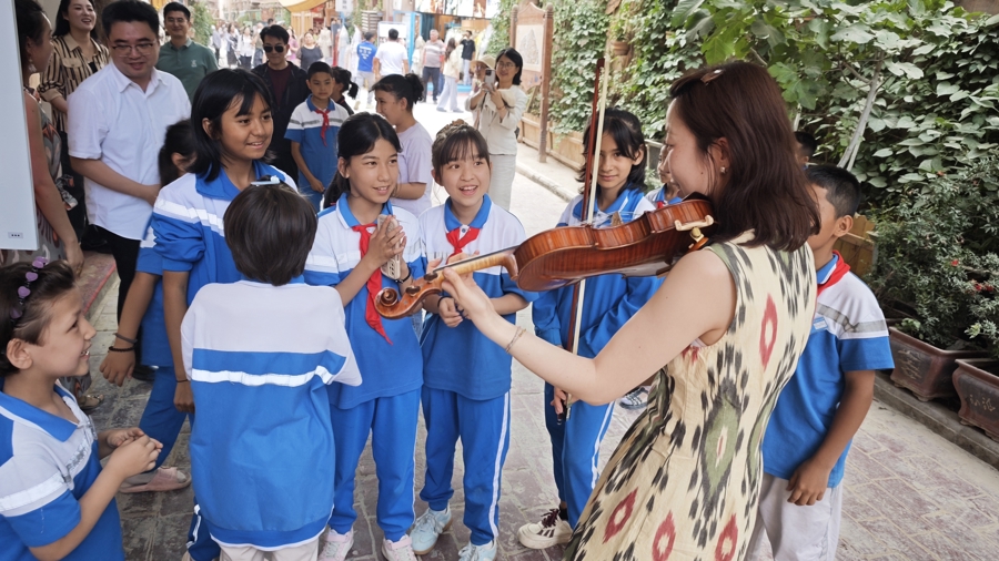 6月16日一抵达喀什,小分队成员就马不停蹄来到喀什古城。夕阳下的喀什古城江南书局热闹非凡,“红色旋律映初心,琴瑟和鸣颂祖国”红色音乐课堂快闪活动在此上演。快闪活动中,小分队邀请现场居民和学生参与互动,大家手拉手欢快舞动,现场气氛热烈。一位当地居民感慨:“活动让我们在欣赏音乐的同时,接受了深刻的爱国主义教育。”