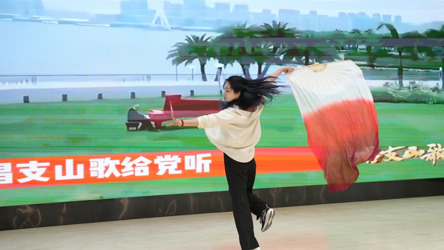 在泽普县第八中学,讲座中一首首承载时代记忆的歌曲和激昂的旋律,串联起党的百年波澜壮阔征程,将师生带入那个战火纷飞、激情燃烧的年代,现场小分队成员与学生热情互动,共唱《青春舞曲》。