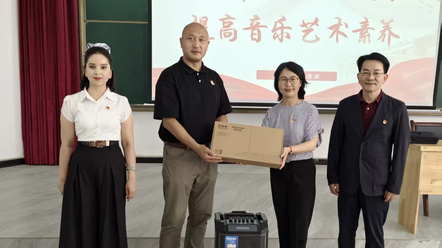 在莎车县喀什理工职业技术学院,上海音乐出版社副总编辑汤家芳代表全社向学院捐赠相关教学设备,助力提升学院师生的演出实践能力与教学信息化水平。小分队成员郑莉娜为师生带来一场别开生面的“红色经典声动校园”语言艺术分享会。