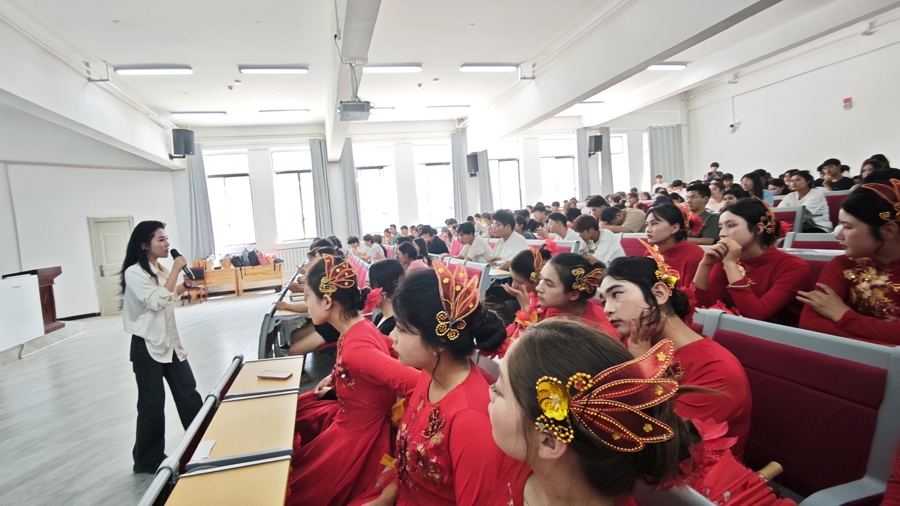 这场分享会围绕播音艺术三个核心模块展开:在“魅力声音塑造”模块,通过呼吸控制、发声训练等技巧教学,帮助师生掌握标准普通话发音;在“有声语言表达”模块,以《七律·长征》等红色经典为教材,示范如何通过重音、停连、语气等技巧提升表现力;在“红色文化传播”模块,师生们共同练习如何讲好优秀党员的故事,在语言训练中感悟红色精神。小分队全体成员与喀什理工学生共同带来《我和我的祖国》《灯火里的中国》《十送红军》《唱支山歌给党听》《如愿》等作品的声乐与器乐表演,在同学们的载歌载舞中将活动推向高潮。