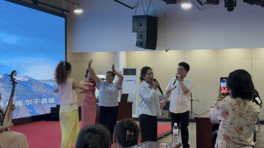 在巴楚县中等职业技术学校,卡地尔尼沙老师和小分队成员深情共唱《灯火里的中国》,美丽开姆上台为《青春舞曲》伴舞。