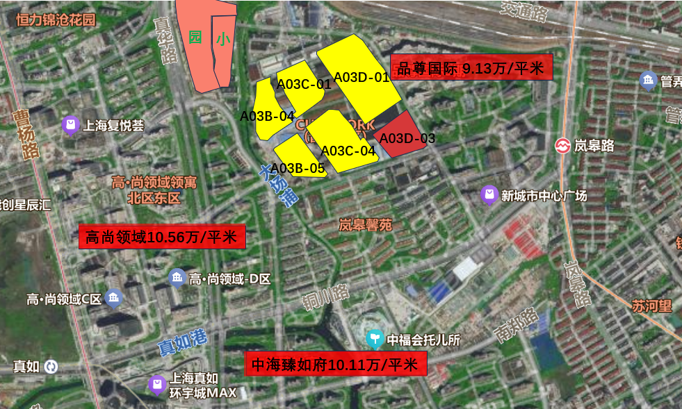 普陀区W060401 单元 A03D-01、A03D-03 地块起始总价为57.15亿元,是本批次出让价格最高的地块。其中,A03D-01地块规划为普通商品房用地,出让面积为34340.46 平方米,容积率2.5,起始楼板价为66569万元/平方米。