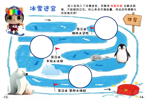 体育闯关活动,一二年级都开启了超燃的冰雪迷宫情境,但挑战难度各有不同。第1关"跳过河流"就迎来刺激考验。面对地面上的模拟"冰冻河流",一年级的小朋友纵身跳跃而过,考验了他们的弹跳力与身体协调性。而二年级的"河流"加宽后,更考验爆发力与反应力。成功跨越河流,一年级的小勇士们直面第2关"走独木桥",踏上微微晃动的低矮平衡木,他们张开双臂保持平衡,一步步平稳前行。二年级还需要跨过圈,才能顺利通过,这既锻炼了胆量,又修炼了平衡能力。最后进入终极挑战第3关"爬过雪山",垫子搭建的"雪山"巍峨耸立,一年级小朋友手脚并用,完成了攀登,二年级的"雪山"更高,还增设"风雪"障碍,更深度锤炼力量、耐力与团队协作能力。层层递进的挑战,从跳跃到平衡,再到攀爬,小朋友们完成了一场精彩的冰雪探险之旅!