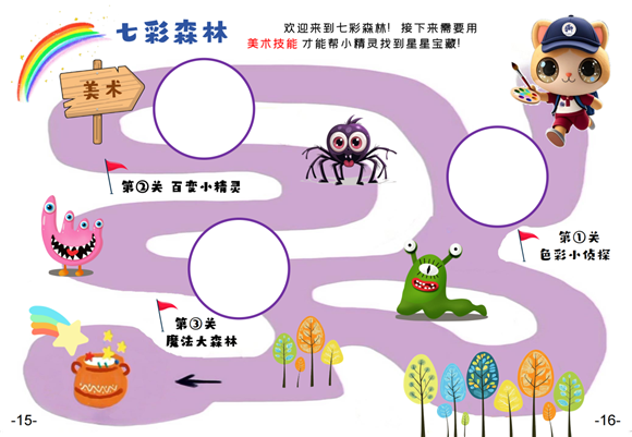 一二年级美术闯关以"七彩森林"为主题,开启沉浸式艺术冒险。
