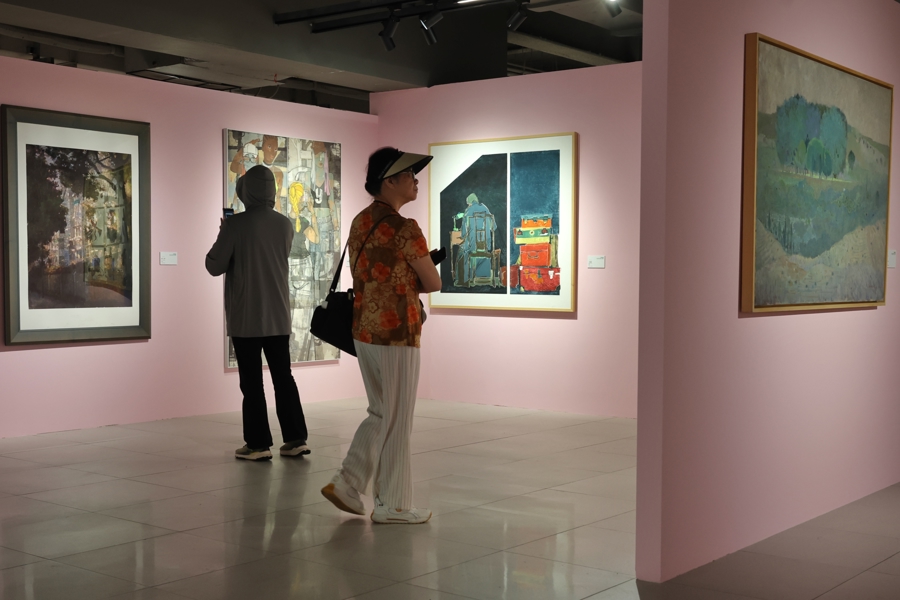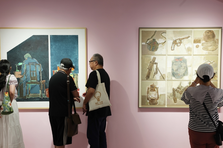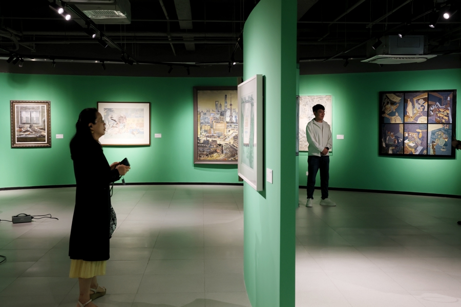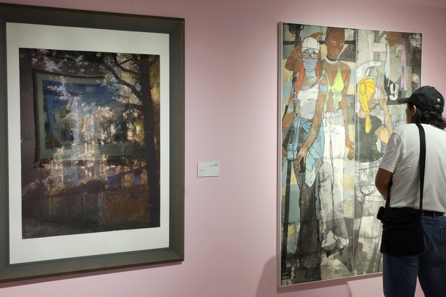 观众在欣赏王辉中国画作品《魔都丽人》,作品捕捉魔都街头活力四射、不同肤色的时尚年轻人风采。