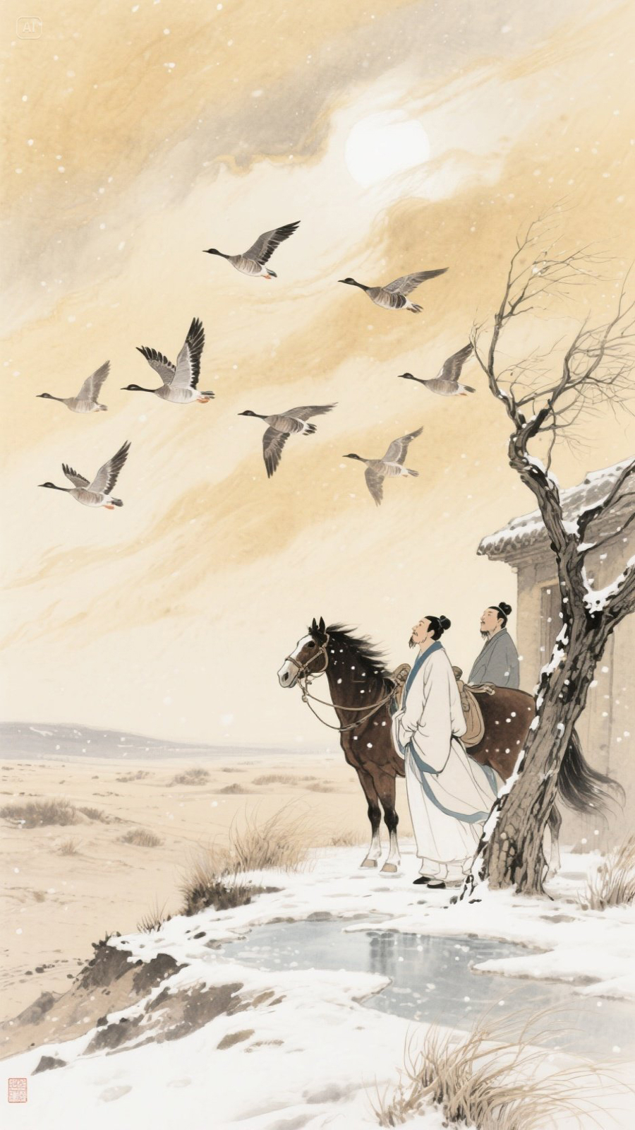 诗篇起笔便是天地苍茫:“千里黄云白日曛,北风吹雁雪纷纷。”六月的风里没有北雁衔来的雪花,却有离别如梅子黄时的雨,淅淅沥沥打湿了青春的扉页,何尝不是一场人生必经的风雨?黄云蔽日、寒风卷雪,看似冷峻的景致却暗藏深意,这不仅是自然的肃杀,更是人生旅途的隐喻。就像毕业时站在校门口回望,熟悉的教学楼、斑驳的梧桐树都裹上了离别的滤镜。高适并未沉溺于感伤,他笔锋一转:“莫愁前路无知己,天下谁人不识君!”一扫黯然愁云,如长风破开迷雾,似晨钟荡彻云霄,既是对友人的抚慰,也是对生命的笃定,真正的才华终会被时光见证,真诚的情谊也终会在岁月里沉淀成光。