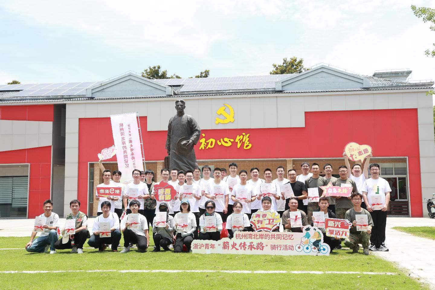 沪浙青年“薪火传承路”骑行活动首先拉开了系列活动的序幕。在明媚的阳光下,40余辆百年国货老品牌凤凰自行车上插着鲜艳的五星红旗,来自金山区金山卫镇、平湖市独山港镇的青年代表神采奕奕、整装待发。