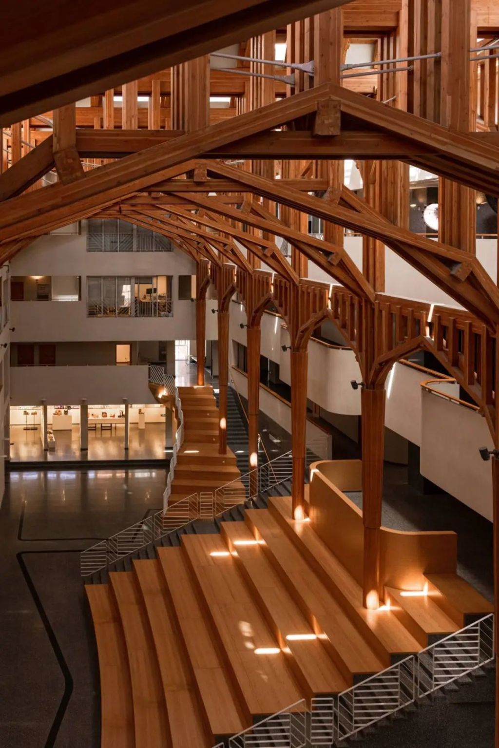 上海交大设计学院阮昕工作室曾通过刊载于《建筑实践》的一篇文章,介绍过这栋建筑的设计理念等。设计大楼的核心空间——大堂是通过对原半室外中庭的围合形成的。结构方面,大堂引入了工程木体系,以缝补结构与支撑屋面。相对于原有的不可持续的钢筋混凝土结构体系,新的工程木是可修复可替换的永续再生结构体系。作为一种中国传统建筑元素,顶部的编木拱是大堂的视觉焦点,但其意义不在形式,而在于形式为核心空间增添的丰富度。房间群组则落在一个非正交的几何网络中:从一层的花园出发,再以大堂中央为核心,向外发散,并在二三四层重叠交错。这些房间群则在回廊的过渡下与大堂相连,整体构成一幅广场般的城市图景。