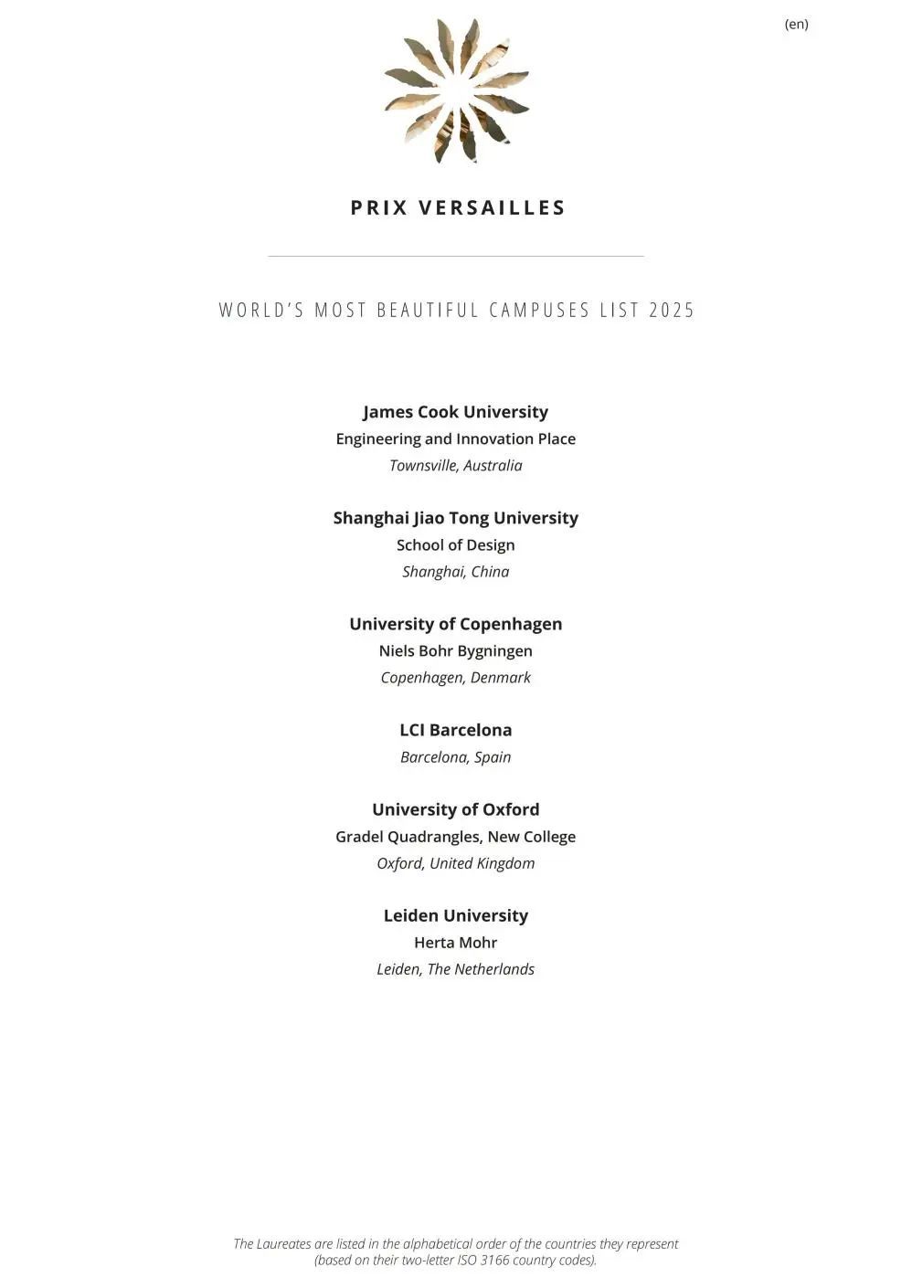 与上海交大设计大楼一同上榜“2025全球最美校园”的还有:英国牛津大学新学院格拉德尔四方院、澳大利亚詹姆斯·库克大学工程与创新中心、丹麦哥本哈根大学尼尼尔斯·玻尔大楼、西班牙LCI巴塞罗那以及荷兰莱顿大学赫塔·莫尔大楼等五所国际著名院校的建筑。
