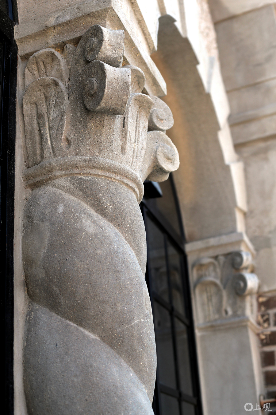 德邻公寓的西南转角阳台是建筑最具特色的部分,立柱为螺旋柱式,是西班牙建筑风格里独有的建筑语言,修缮期间对原先覆盖的涂料进行清洗和剥离,还原了历史原样。阳台的栏杆同样是亮点,绿色的琉璃砖材质,保留得比较完好。外立面为泰山面砖,大部分都保留了下来,对于局部缺损部位逐一进行修复。