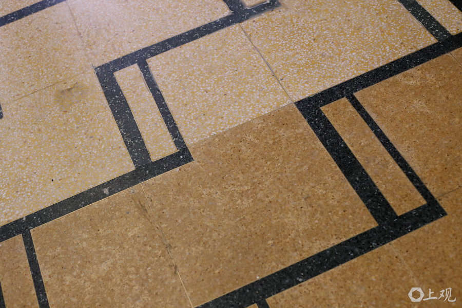 西南门厅铺地在施工过程中,发现存在一层水磨石地坪。经设计考证,为历史方案保留修缮状地坪并将图样式扩大至整个西南门厅。