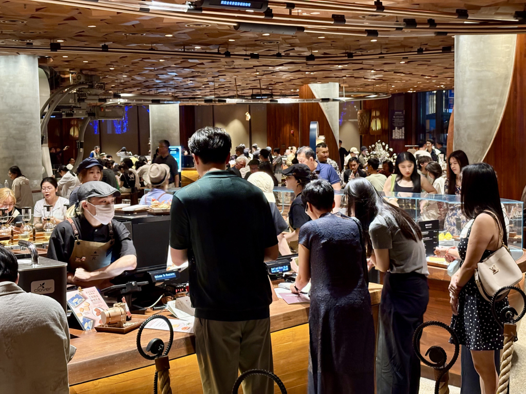 调侃归调侃,星巴克还是凭借地理优势稳稳接住了这波“富贵”。6月26日晚,隔壁“大船”星光熠熠,星巴克的员工和机器连轴转不停,尽管二楼关闭,一楼却是客满,户外座椅和花坛边都坐满了人。晚上9点过后,点单的队伍依然很长。