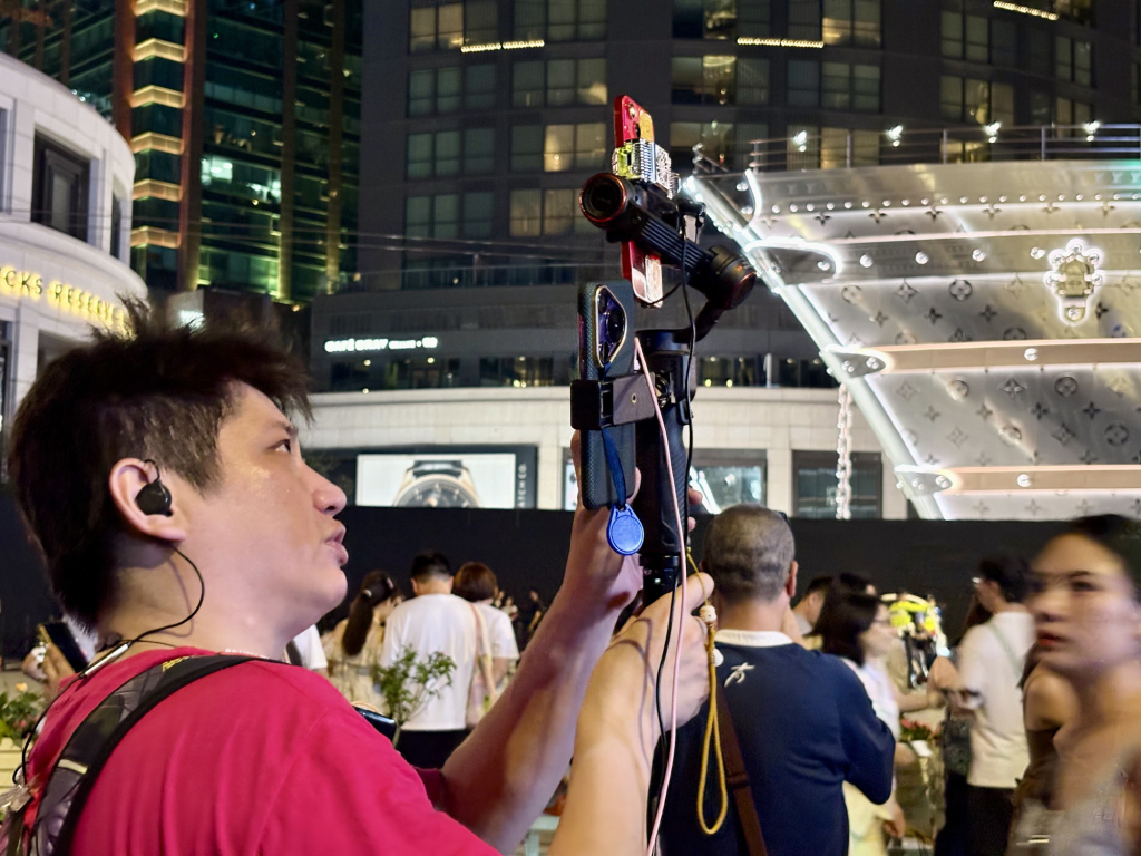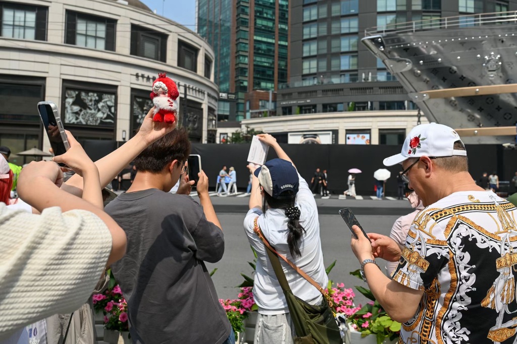 当天,巨轮外围设置了3米多高的围挡,却没能阻挡人们的热情。对面的吴江路路口成为最佳拍照点,一眼望去人潮密密匝匝,男女老少都举着手机寻找角度,背包上挂着Labubu的男子手持稳定器边直播边放音乐,白裙女子、墨镜男子纷纷亮相……四周广告牌已经被LV承包,警察在各个路口守着,喇叭里循环播放着“大家走起来,不要在人行道上拍照停留”。