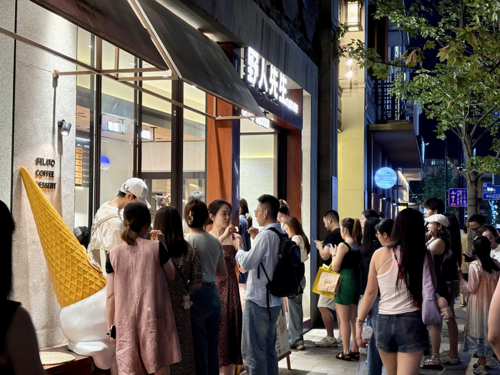 乌泱泱的人流,从南京西路、石门一路、吴江路蔓延到茂名北路,餐饮、零售等各类店铺在此密布。一家冰淇淋店在9点后推出“买一赠一”,年轻男女拥在门口排队。店员第二天回忆道:“我们平时客人也多,昨天的客流确实格外高。”