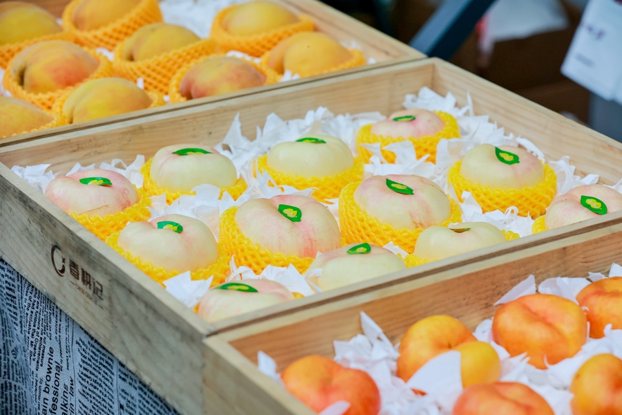 今天在思南公馆区域,也迎来一场不同于往日的市集活动。据思南公馆副总经理范美辰介绍,思南公馆与上海市农业农村委员会首次合作,将那些远在郊区的有机农产品、时令水果搬到思南公馆,在鸡尾酒的香气里,在爵士乐的律动下,有顾客尝了一口崇明黑猪肉制作的烤香肠,顿时“豪气”下单两箱礼盒装;远在浦东新区大团镇的上海谷东农副产品专业合作社,带来的大团镇水蜜桃和头茬“8424西瓜”一路畅销,“以前主要通过线上团购触达消费者,今天能够直接与消费者面对面,听到大家对产品的真实感受,希望今后能有更多类似的机会”,合作社负责人黄红看到产品得到市民认可,感到十分惊喜。