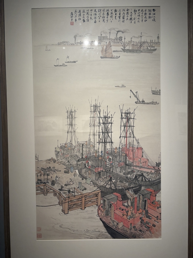 应野平之子应黎声回忆,20世纪五六十年代,正是父亲的创作高峰之一,他到全国各地写生,回来就画速写。这次展览正是创作于这个时期的作品居多,大尺幅作品《千帆迎晓日》就是应野平经历了好几次舟山群岛写生的结果。应黎声透露,展览中有一幅书法作品创作于1961年,地点在佘山,是应野平思及三十年前与弟弟同游佘山的情景时,触景生情而作。而应野平的弟弟参加革命,在诸暨牺牲。“父亲的两位兄弟都是革命烈士,因而父亲的作品中几次三番以井冈山为主题,他对红色题材倾注了很大的精力,充满了感情。”