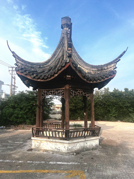 澎湃新闻记者从九里亭街道了解到,九里亭因亭得名:泗泾、七宝两地水路相距十八里,古人在中间修建一座凉亭供船夫和行路人休息,因凉亭距两地各九里,故称九里亭。据史料记载,九里亭始建于南宋咸淳年间,距今已有700多年的历史,曾因年久失修坍塌,后经多次重建。2005年,因轨道交通9号线过境,复建的九里亭被拆除,2006年移建于九里亭居委会办公地大院内。时光流逝,如今九里亭居委会早已搬迁,而这座亭子目前位于中铁十五局上海新能源发展有限公司的内部停车场内,不对外开放。