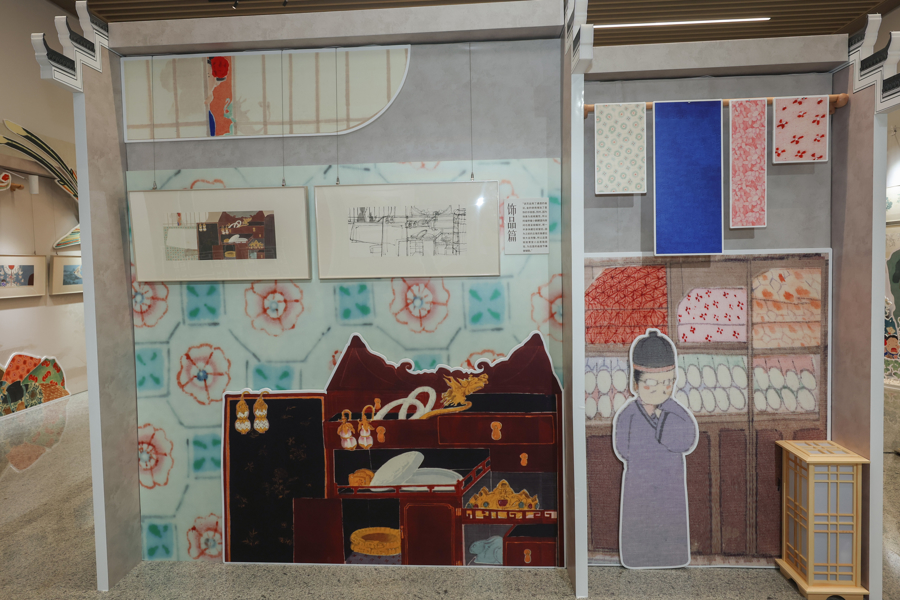 走入四楼创意工坊的展厅,仿佛穿越时空,走进了绘本中“江南园林、水乡码头、街坊闹市、静谧闺门”的江南世界。淡雅的水墨色配上古色古香的建筑元素,将绘本中的江南韵味展现得淋漓尽致。
