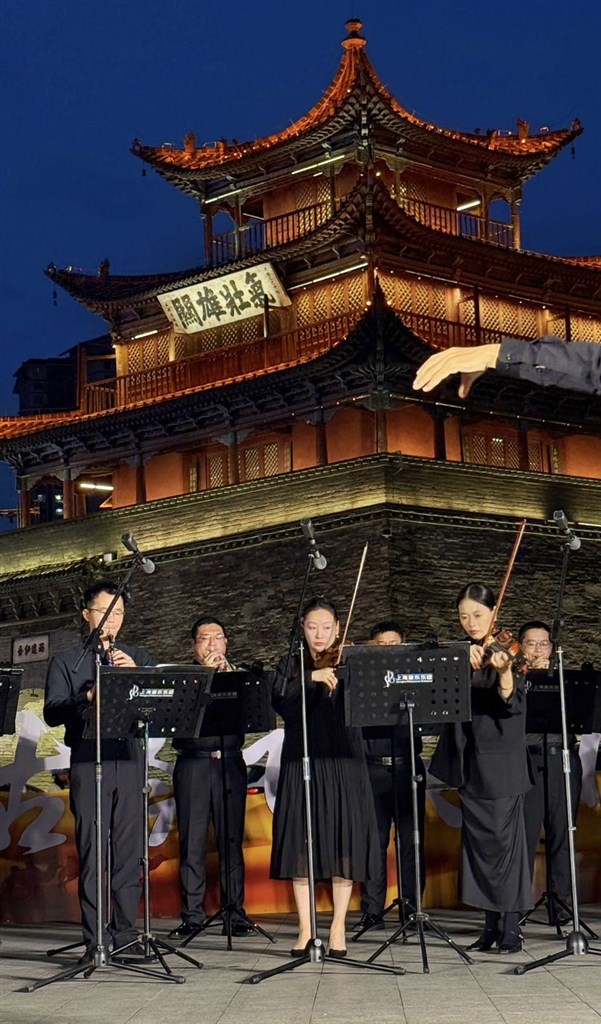 元杰特意将曾亮相天安门广场庆祝中国共产党建党百年的九尺钢琴,历经8天从广州运来。他表示:“看到观众沉浸在音乐中,在《保卫黄河》尾声全场屏息聆听,仿佛一同重温那段激情岁月,从中汲取前行的力量。” 上海爱乐乐团党总支书记、副团长陆蕾曾见证神舟二十号载人飞船发射,此次带领乐团再次来到这里,演出前开展的爱国主义教育活动让艺术家们深受触动。陆蕾说:“这不仅是巡演,更是一次精神洗礼,年轻艺术家们用音乐向航天人致敬。” 从机场、医院到古城楼,处处有音乐 上海爱乐乐团的甘肃之行,早在6月23日浦东机场便已开启。张亮指挥60余名音乐家现场演奏《红旗颂》《威风凛凛进行曲》等曲目,让机场化作开放的城市音乐厅。