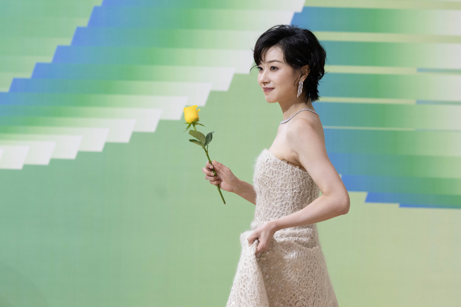 万茜手持黄玫瑰代表《玫瑰的故事》剧组走红毯。
