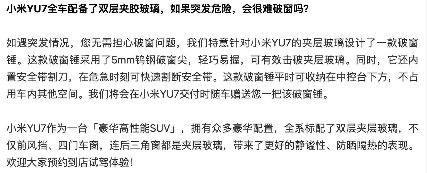 YU7双层夹胶玻璃如遇险情,是否很难破窗?小米回应