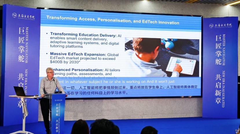 卡德韦尔教授以“引领全球教育人工智能革命的技术与创新”为题发表主旨演讲,深刻剖析AI对教育体系的颠覆性影响。他结合剑桥大学管理经验与工程学背景指出,全球教育者的核心任务是借助数字技术特别是AI重塑教学模式、优化资源配置,并前瞻性定义人才培养目标。