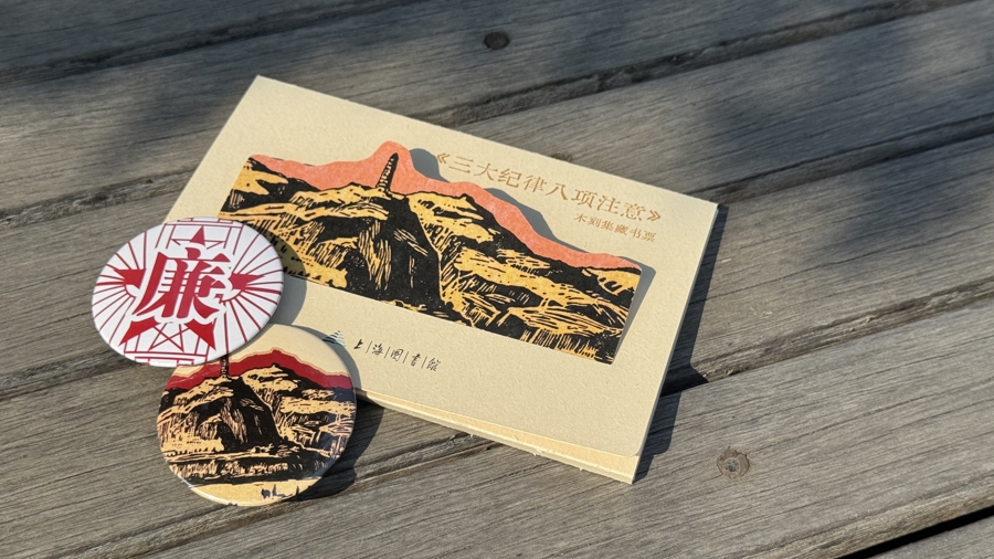 上海图书馆POD空间还以现场展陈的9件珍贵实物文献之一《三大纪律八项注意》木刻集为蓝本,复刻推出专属文创,包含一套木刻版画藏书票和两枚纪念徽章的文创套装,让观众将展览中的红色珍本带回家,使百年作风精神融入日常。