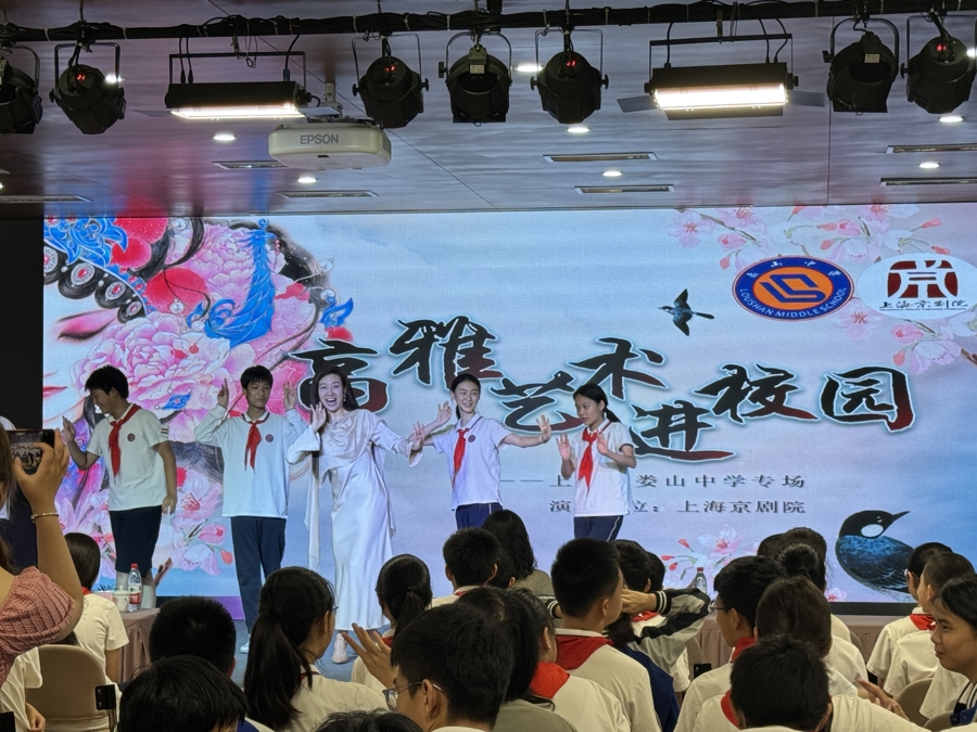 近日上海市文旅局、上海市教育局携手上海京剧院走进娄山中学,演员们现场教学,同学们在“京剧小课堂”亲身体验京剧身段,沉浸式体验国粹的魅力,“原来一个简单的开门都这么讲究”“老师们功底深厚,一招一式尽显专业”。