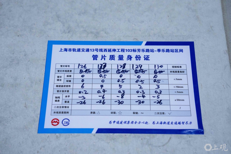 隧道内随处可见的管片质量记录表,管片错台数据均在一毫米以内。