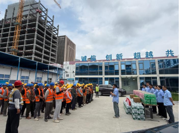 慰问活动中,项目安全总监梁义军同志代表项目部向项目人员和工友进行了重点强调与工作部署。表示要加大现场安全巡查频次和力度,重点检查高处作业、动火作业、大型机械设备操作等高风险环节,对发现的安全隐患“零容忍”,立查立改。要确保施工现场配备足够的通风降温设施,提供充足、卫生的防暑降温饮品(如盐汽水、绿豆汤等),配备必要的急救药品和设备,并确保应急通道畅通无阻。项目方将不遗余力地切实保障每一位施工人员的健康安全和整个工程建设的平稳有序推进。