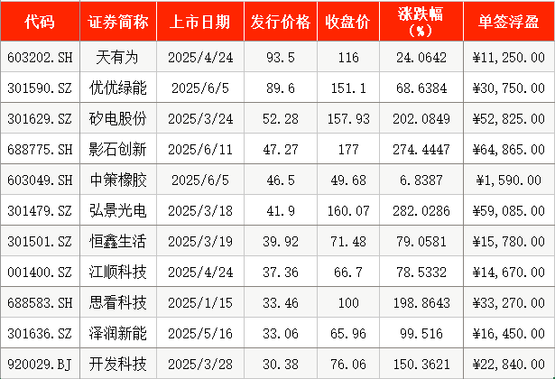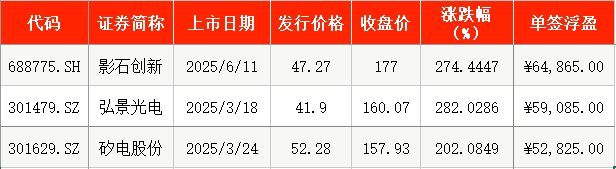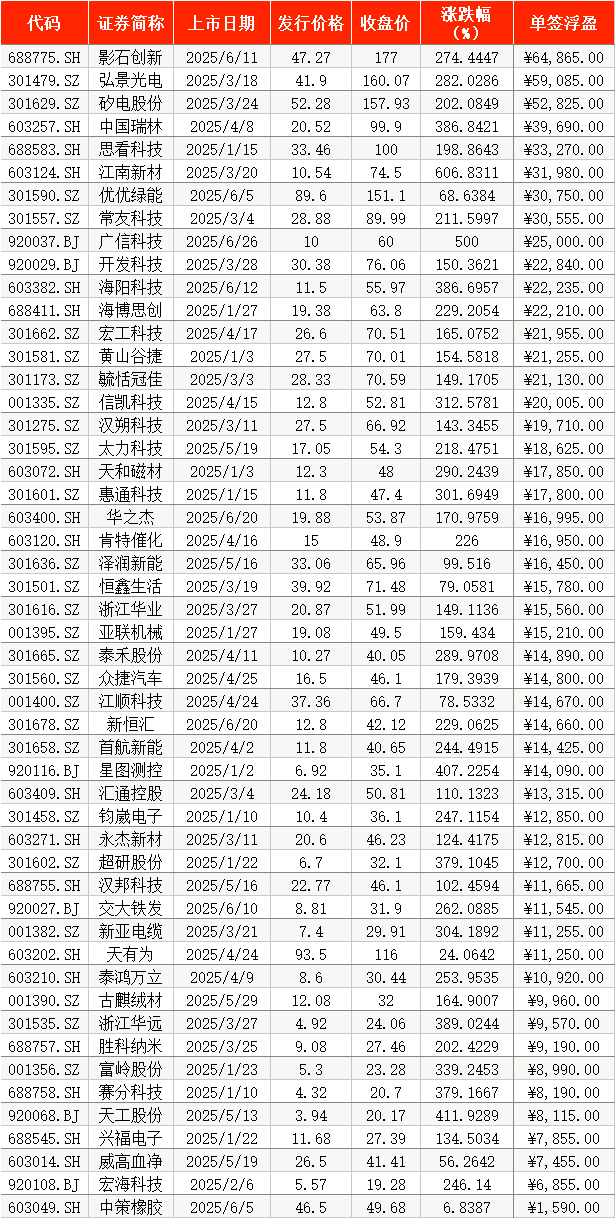 2025年上半年上市的新股中,有1只新股的首日收盘单签浮盈超过6万元,有2只单签浮盈超过5万元。