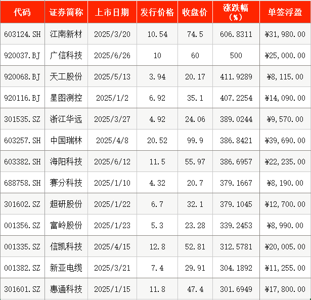 其中,3月20日上市的江南新材,首日涨幅高达606.83%,排名第一。按收盘价计算,投资者单签浮盈3.20万元。