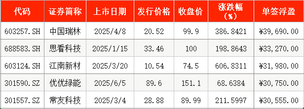 与此同时,中国瑞林(603257)、思看科技(688583)、江南新材(603124)、优优绿能(301590)、常友科技(301557)等5只新股,首日单签浮盈均超过3万元。
