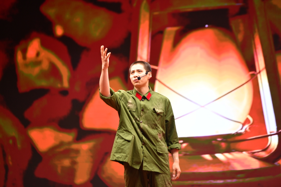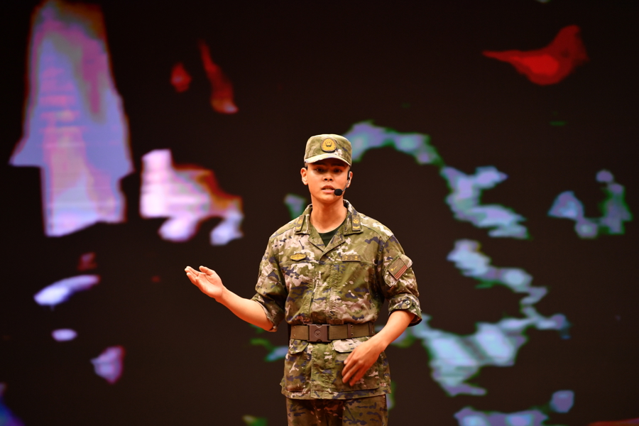 《声影》舞台上,战士们用整齐的队伍、铿锵的步伐、嘹亮的歌声展示了军人保家卫国的决心。