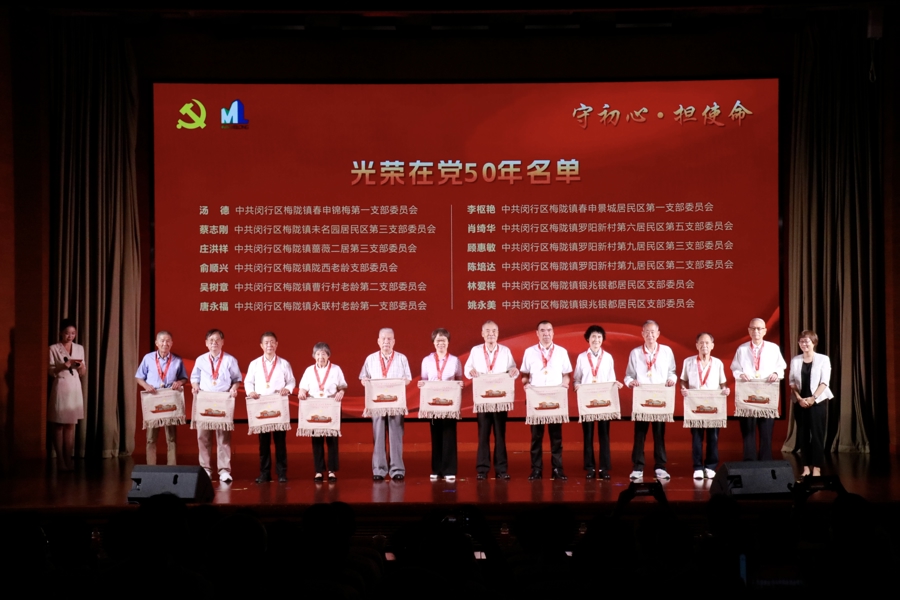 当天的大会上,梅陇镇为12名光荣在党50年老党员代表颁发纪念章,为全镇被命名为闵行区“五星党(总)支部”的党组织和闵行区“两岗一区”、新时代先锋堡垒、新时代好班长代表颁发荣誉,并为获得梅陇镇“陇上同心‘治’力”荣誉的优秀业委会、物业企业、楼组长代表颁发证书。