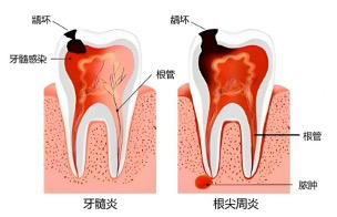 多由于牙髓炎未及时治疗后发展而成,主要症状为患牙咬合痛,随着病情发展可出现持续自发性疼痛、根尖部牙龈红肿,严重者会出现根尖周牙周膜破坏溶解,形成脓肿。如果脓肿不能释放,突破牙骨质表现在牙龈部位,则会在相应的牙龈部位形成瘘管。