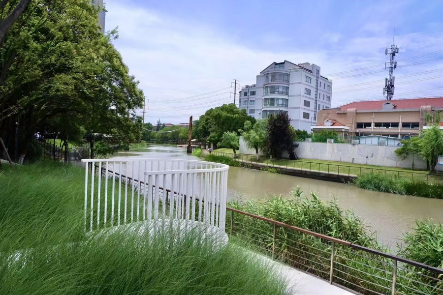 漫步在公园深处的临河步道,漕河泾港的清澈水色尽收眼底,与两岸绿意相映成趣。此外,公园利用临水特点,结合“健身+水环境”特色,设计了创意文化小品,让居民们能够享受到天蓝水绿的自然美景。