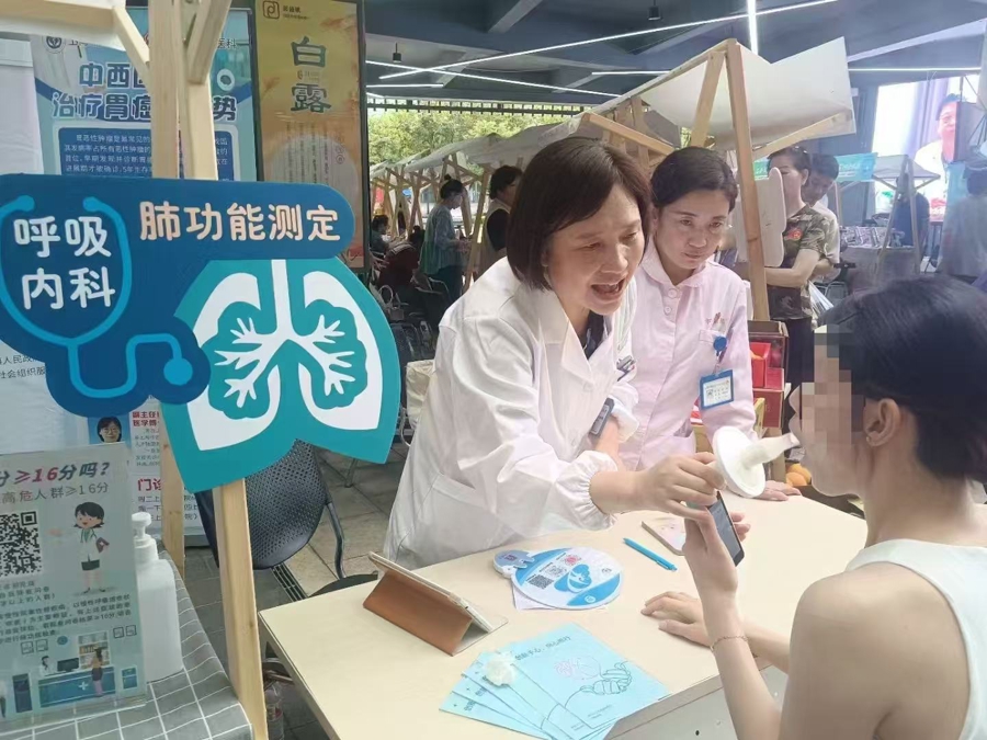王瑾主任在义诊时,辅导居民做好肺功能测试。张慧芬 摄
