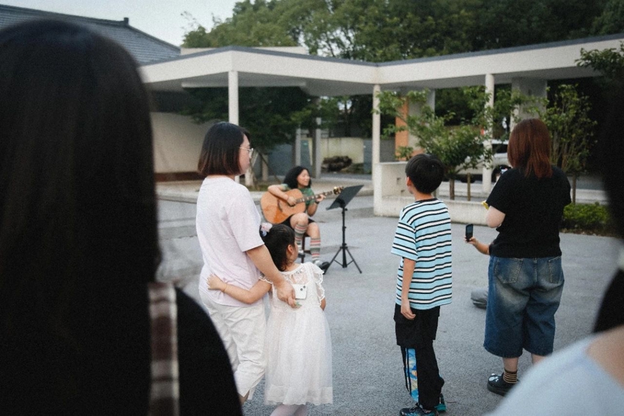 周末傍晚,夕阳的余晖洒在金山区朱泾镇新泾村的村口广场上,27岁的Lily轻轻拨动吉他琴弦,调试着音准。这场由乡村艺术平台“隔壁”举办的夏夜弹唱会,正在这个寻常却又特别的时刻缓缓拉开序幕。“隔壁”平台主理人张林莉说:“夏天傍晚六七点是村民最松弛的时候,孩子们放暑假回到村里,大人们结束了一天的劳作,这个时间段最适合举办户外活动。”