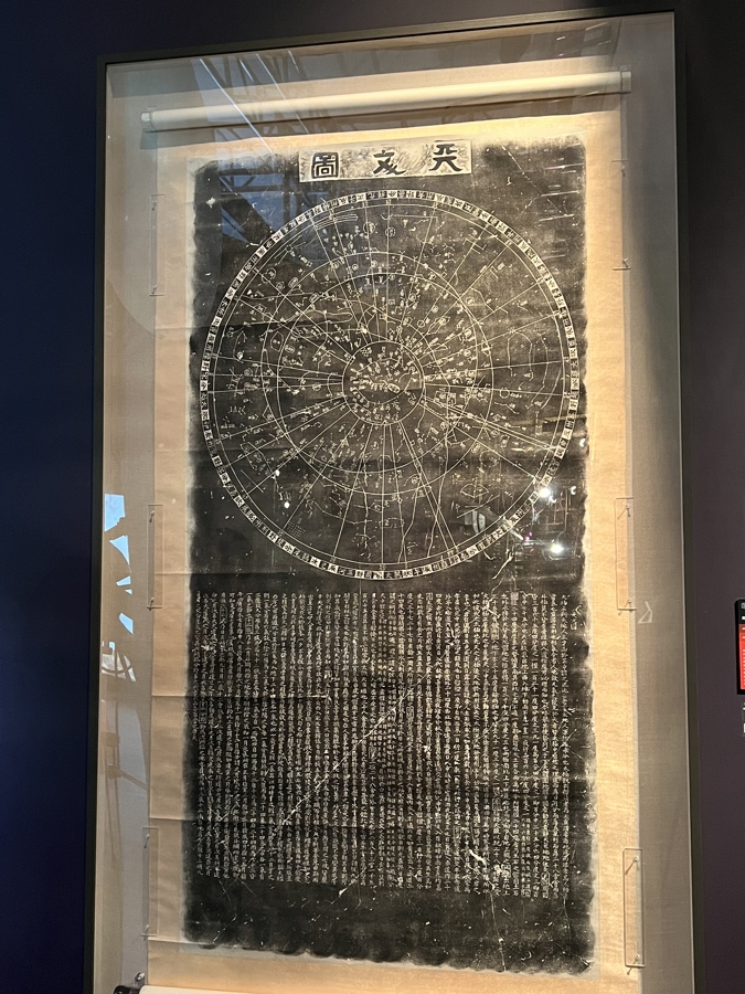 在雕塑右侧,《南宋天文图碑拓片》与之形成跨越时空的对话。这幅由南宋礼部尚书黄裳于淳祐七年(1247年)主持刻制的星图,不仅系统绘制了1434颗恒星,还标注了赤道、黄道、二十八宿等天文标记,其科学性和完整性远超同时期欧洲星图。现代天文学研究证实,该星图记载的星位与现代星表高度吻合。两件展品并置,既展现了东西方探索宇宙的不同路径,又共同诉说着人类对星空永恒的好奇与追寻。