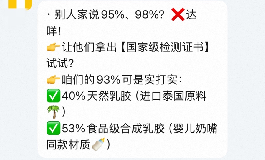 一款号称乳胶含量高达93%的“乳胶席”,其中天然乳胶占比只有40%。