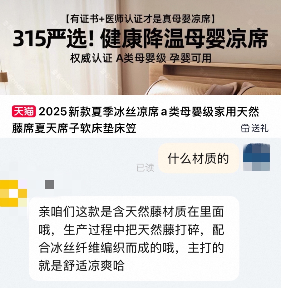 电商平台一款“天然藤席”没有提供材质说明,记者询问客服被告知是“打碎的天然藤”与化纤合成的。