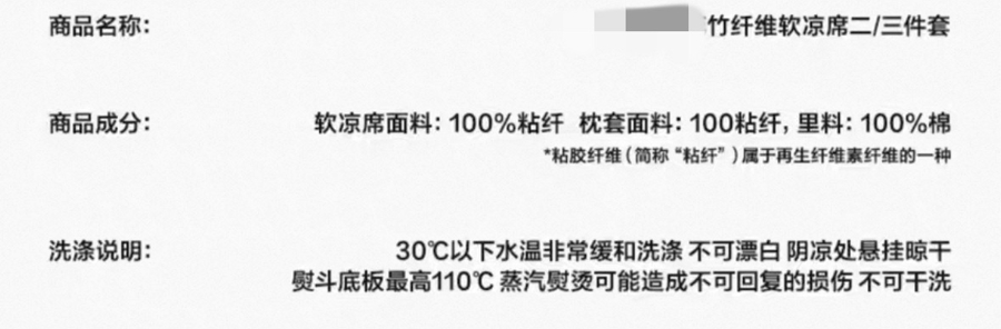 相对而言,新产品中的“竹纤维席”或“藤纤维席”更值得信赖。这类产品是将竹子或藤条通过物理或化学方法提取出纤维素,再经过纺丝工艺制成,兼具了原材料的天然透气性和纤维材料的柔软性。这类纤维有个共同的名字叫“纤维素纤维”,也叫“粘纤”,所以部分商家会在产品材质上标注“纤维素纤维”“粘纤”。不过,并不是所有的粘纤都以竹或藤为原料,消费者同样要提防“文字游戏”。