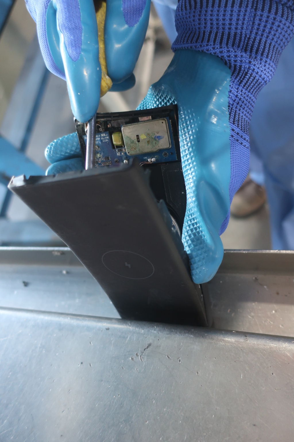 王意中说,充电宝的销毁,主要是一个拆解充电宝的过程,拆解完后,充电宝的主要组成部件是:外壳(金属或塑料)、控制主板和电池芯。