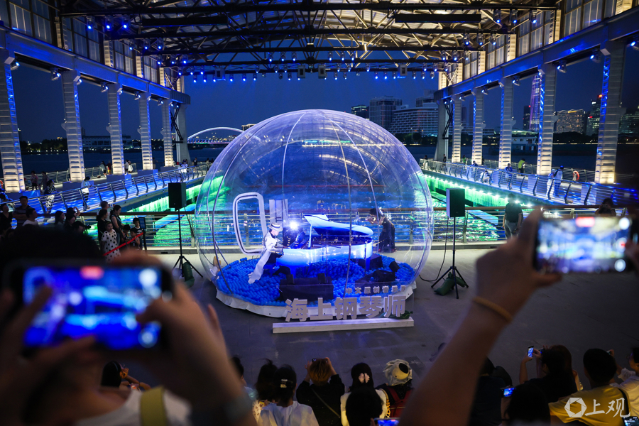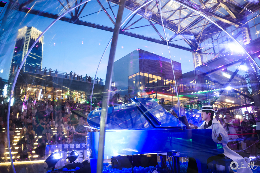 在西岸梦中心的船坞码头,一个名为“海洋泡泡”的装置吸引了众多目光,蓝色的钢琴被蓝色海洋球簇拥其中,仿佛置身于电影中的场景。